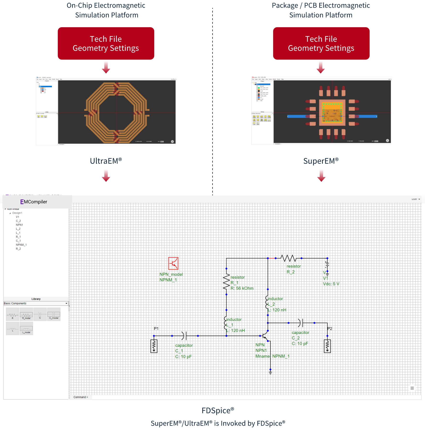 FDSPICE® is a system-level full-wave electromagnetic design platform for simulation, modeling and design optimization of large-scale RF, microwave, millimeter-wave and high-speed digital circuits. FDSPICE® uses the state-of-the-art artificial intelligence (AI) technology to perform fast simulation, modeling, and design optimization by virtue of innovative proprietary AI models.